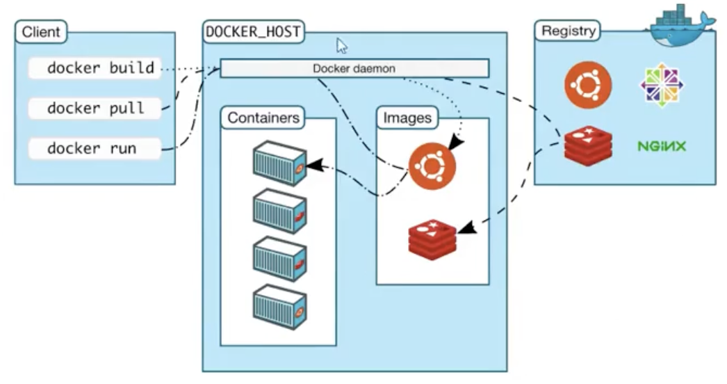 Docker host 내부에서 docker daemon이 이미지를 내려받아 container를 실행시키고 관리한다.